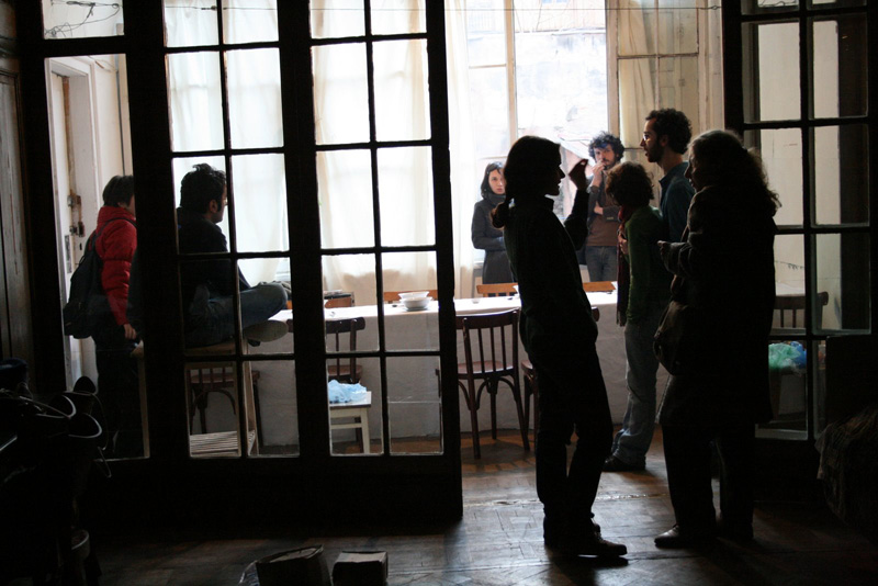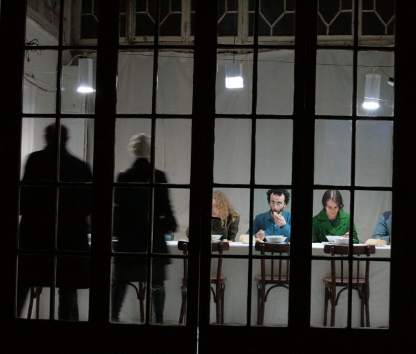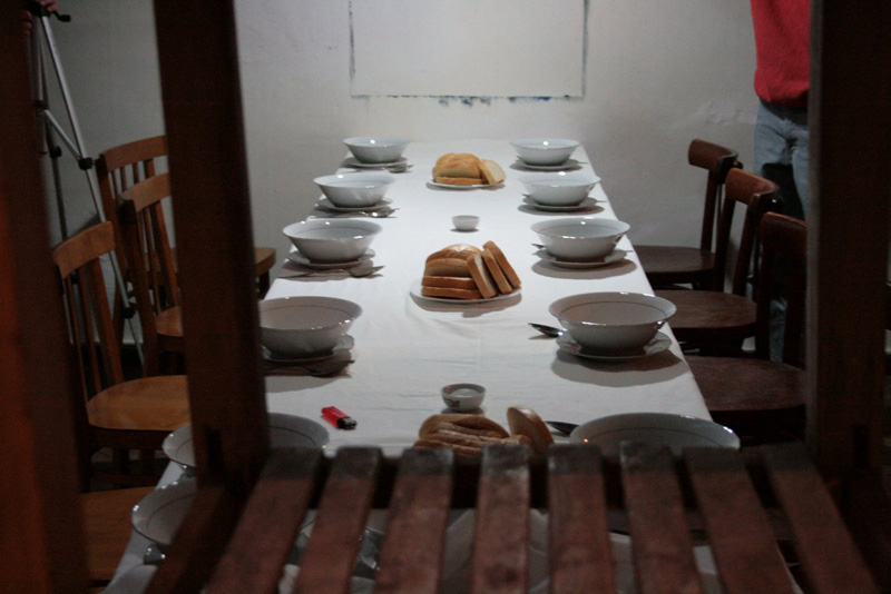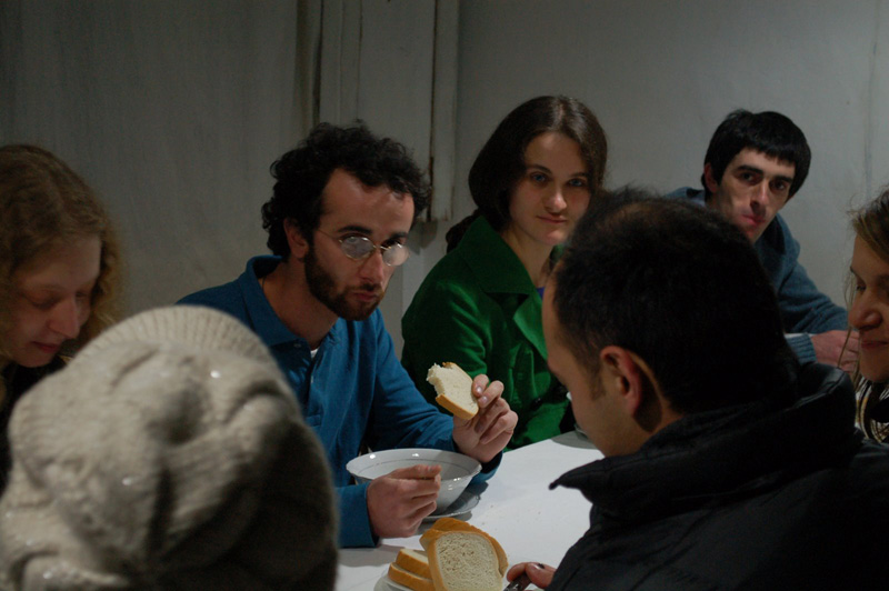 “Flat 3” was the third project from apartment series. The action was going in two room’s flat, one of the streets of old Tbilisi. There was a table with twelve plates (six at one side and six at another) in one of the room, one side of the table was occupied by six artists and you could see and join them. This action was the group`s presentation, by eating bullion artists offered public daily occurrence.