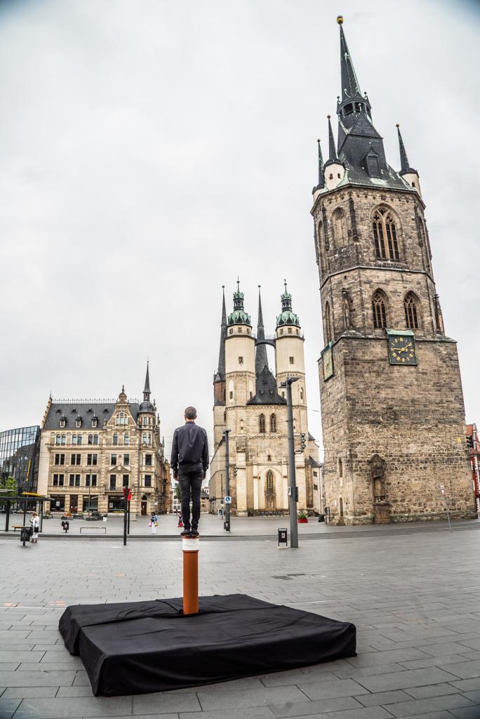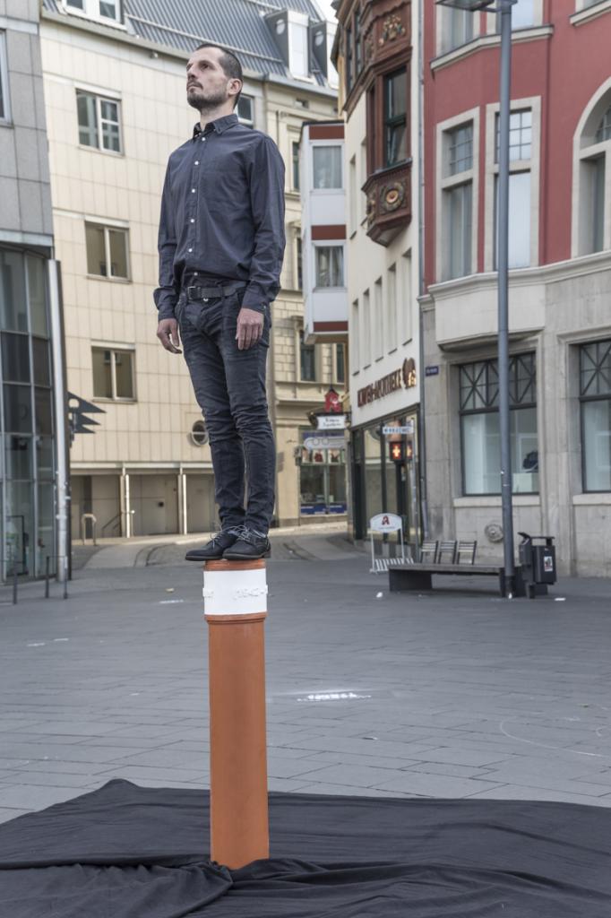 The pop-up monument in a public sphere commemorates the Dutch artist Bas Jan Ader. Although visually it appropriates the conventional forms of memorials, it presupposes the personal devotion as an essential expressive matter of the work: In the performance performer will remain standing on the pole resisting the inevitable state of exhaustion to the most possible extend. The aspects of personal respect and deep honour to the artist remains the bases for this action of resistance.