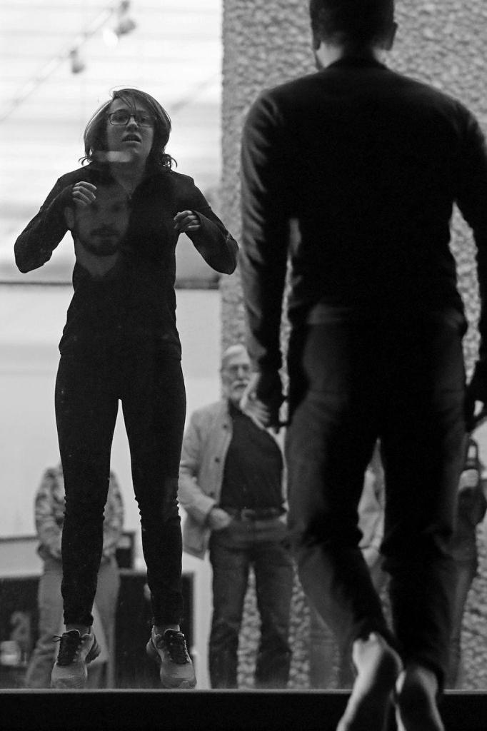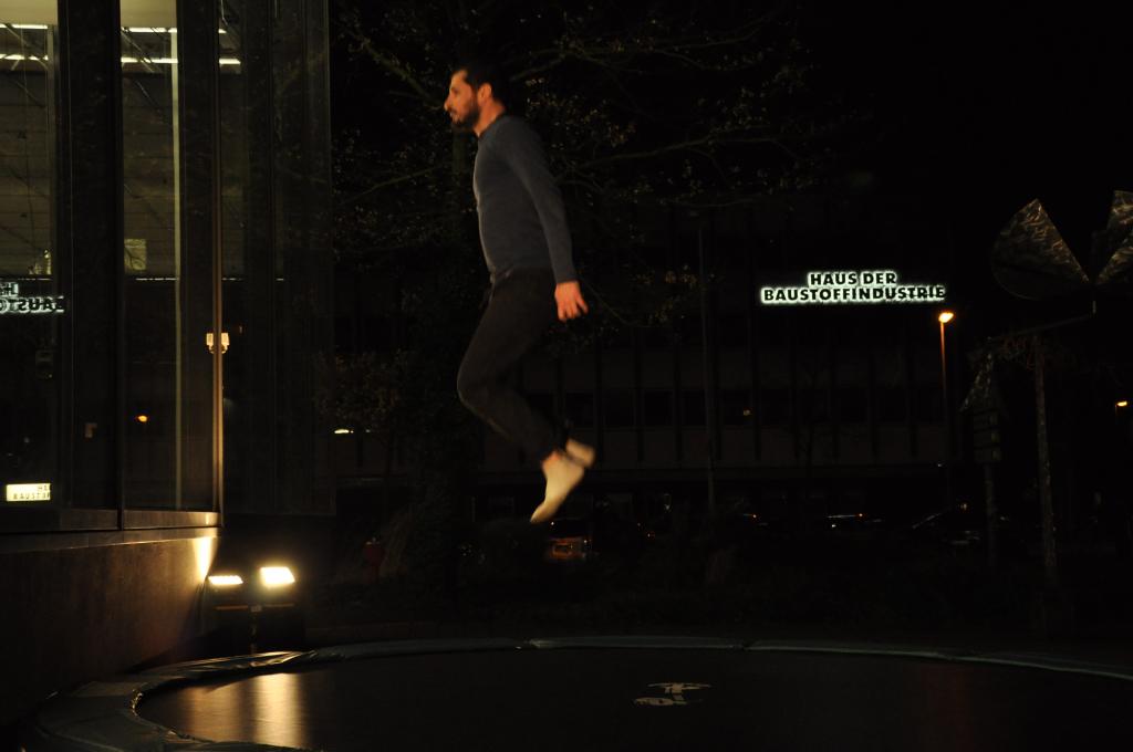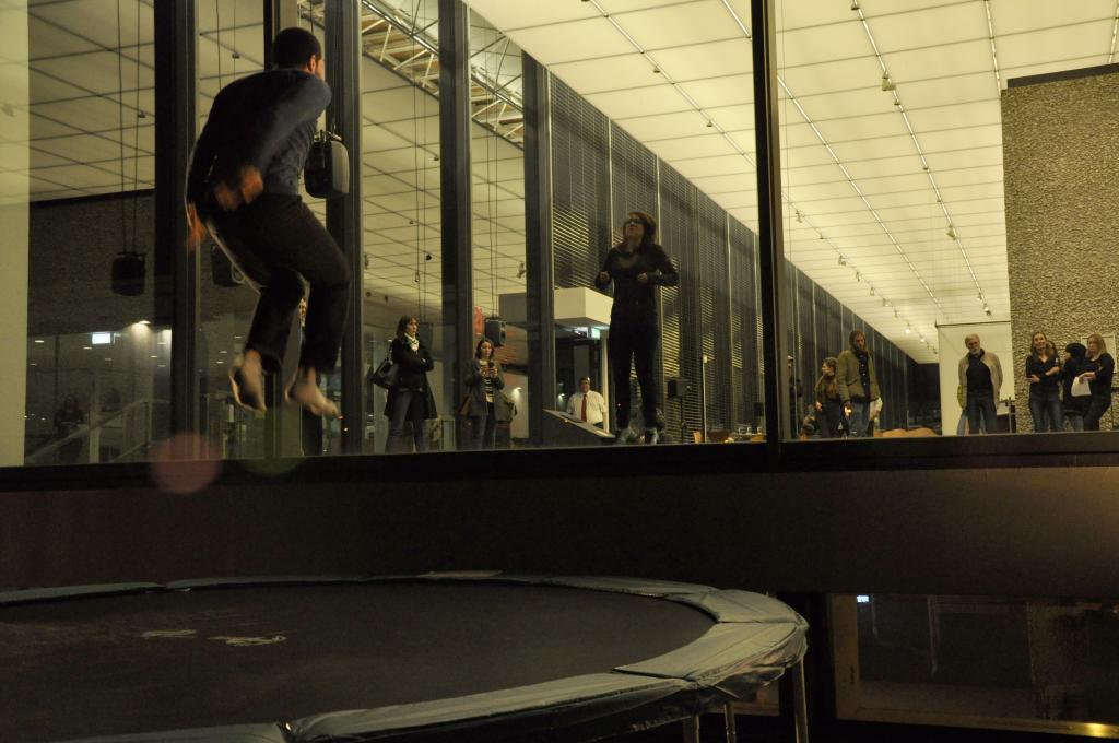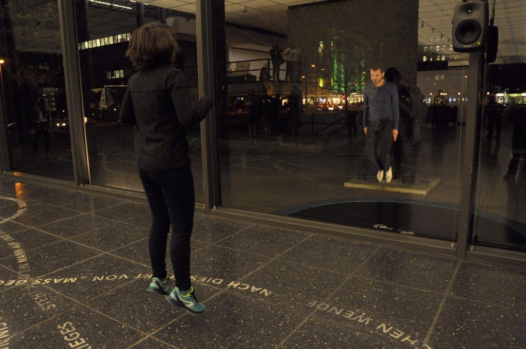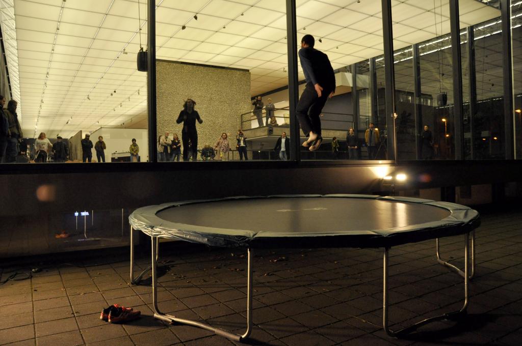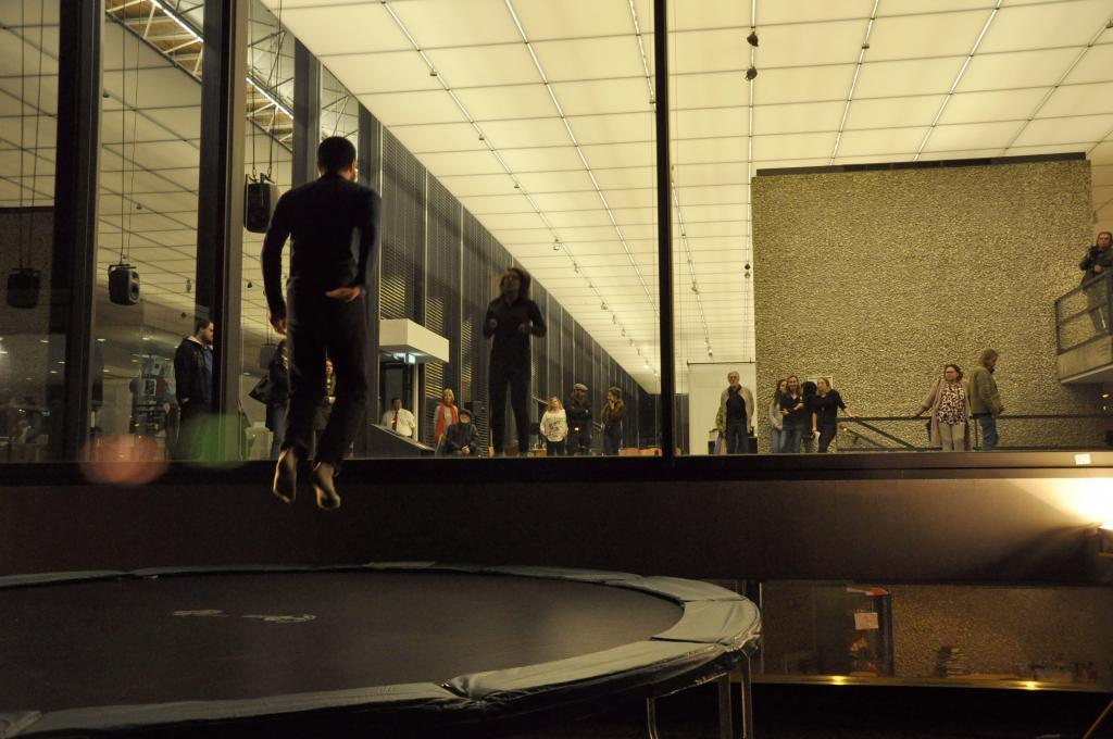 The work is performed by the two artists engaged in continual synchronous jumping on the opposite sides of the glass wall of the Lehmbruck museum. In spite of difference in high and of the platforms for action they are trying to share the same summit in the peak of jump and retain the rhythmical connection between each other through the transparent divider.