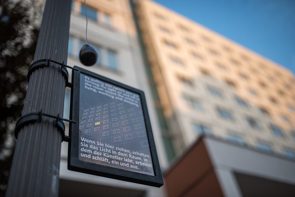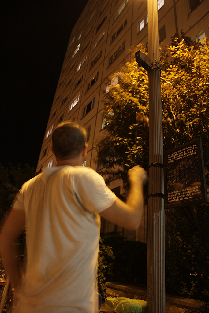 THE PUBLIC ARTIST is an interactive installation which consists of a pull switch installed on one of the streetlights in front of Jakobsplan. During the two weeks every passerby had 24-hour access to switch on and off the light in the private space where artist was living, working and sleeping. Intervening in his privacy, everyone was given the possibility to challenge the socialization of the inhabitant, who claims to be a “public artist”.